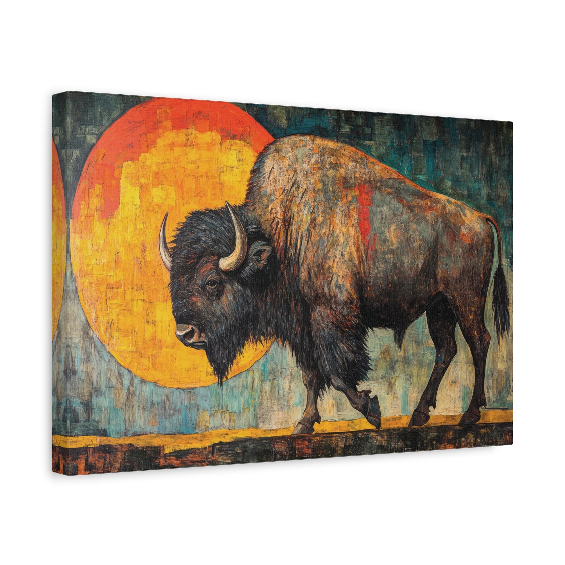 AMERICAN BISON – The rich but slightly muted colors of the bison and background sky combine with the vibrant sun to bring a feeling of calm power to a room, particularly in the larger sizes. The subject, composition and color palette compliment a wide variety of decors.
