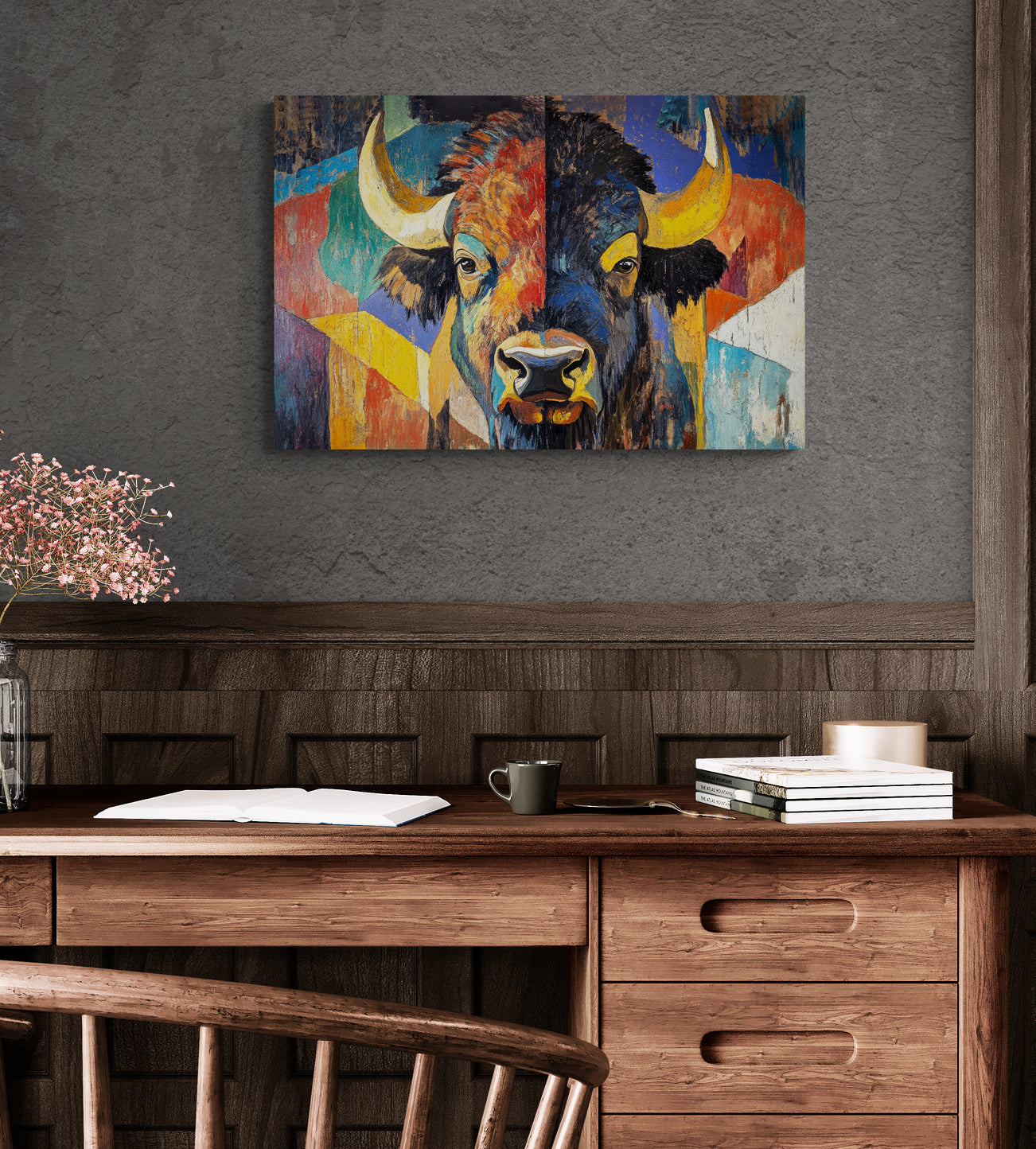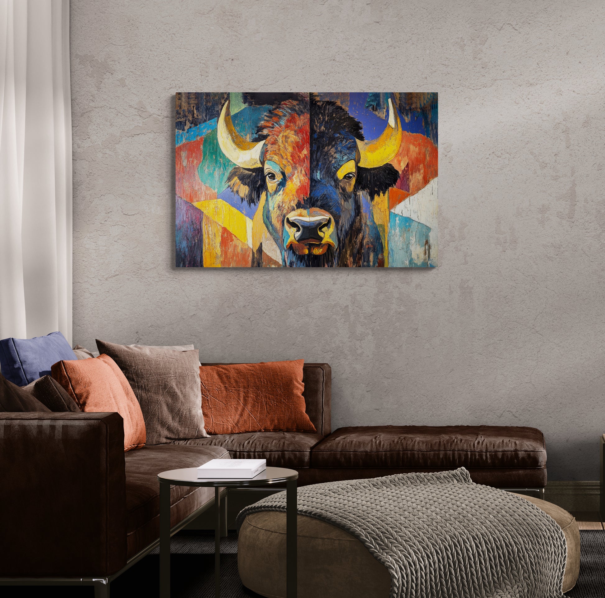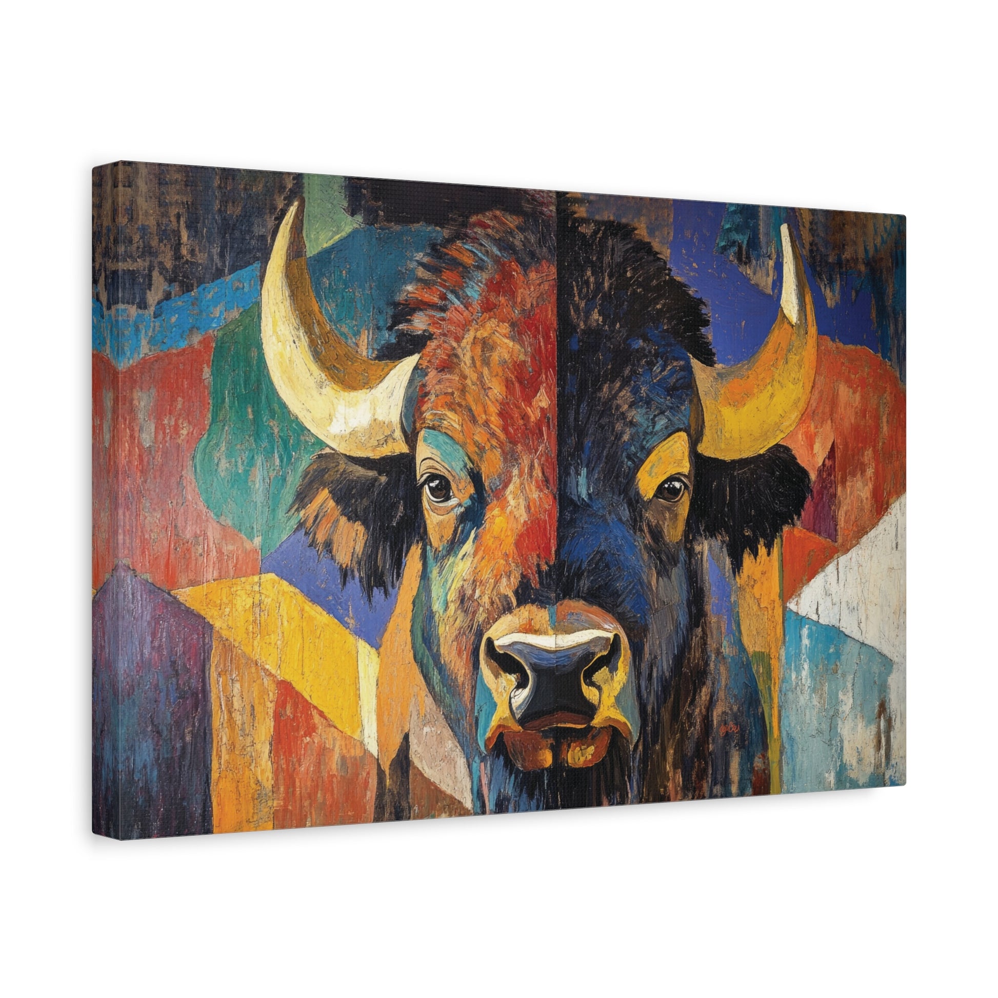 BISON EYES - The vibrant color, loose brushstrokes and bold graphic style of this beautiful abstract work first get your attention, then guide you to the calm, contemplative expression in the bison’s eyes. This stunning artwork makes a perfect statement piece and pairs well with AMERICAN BISON.