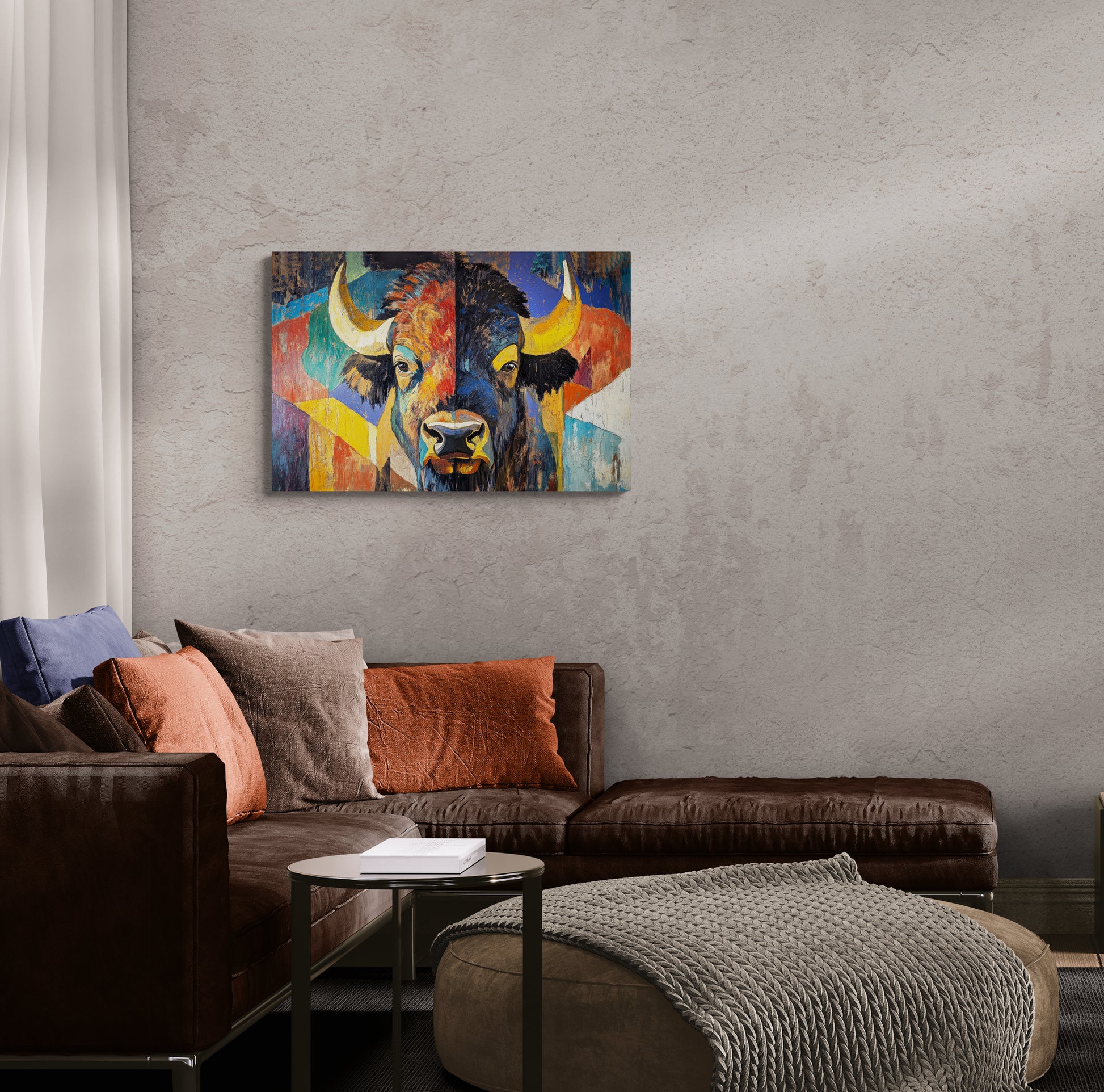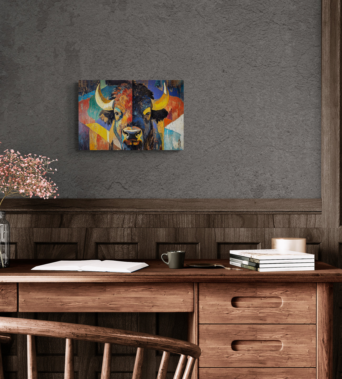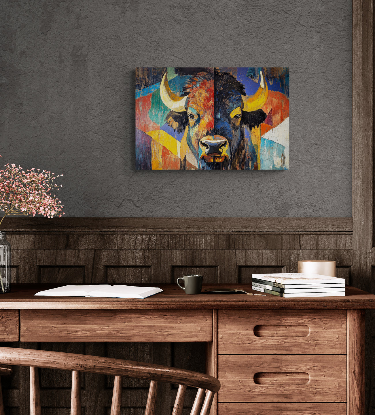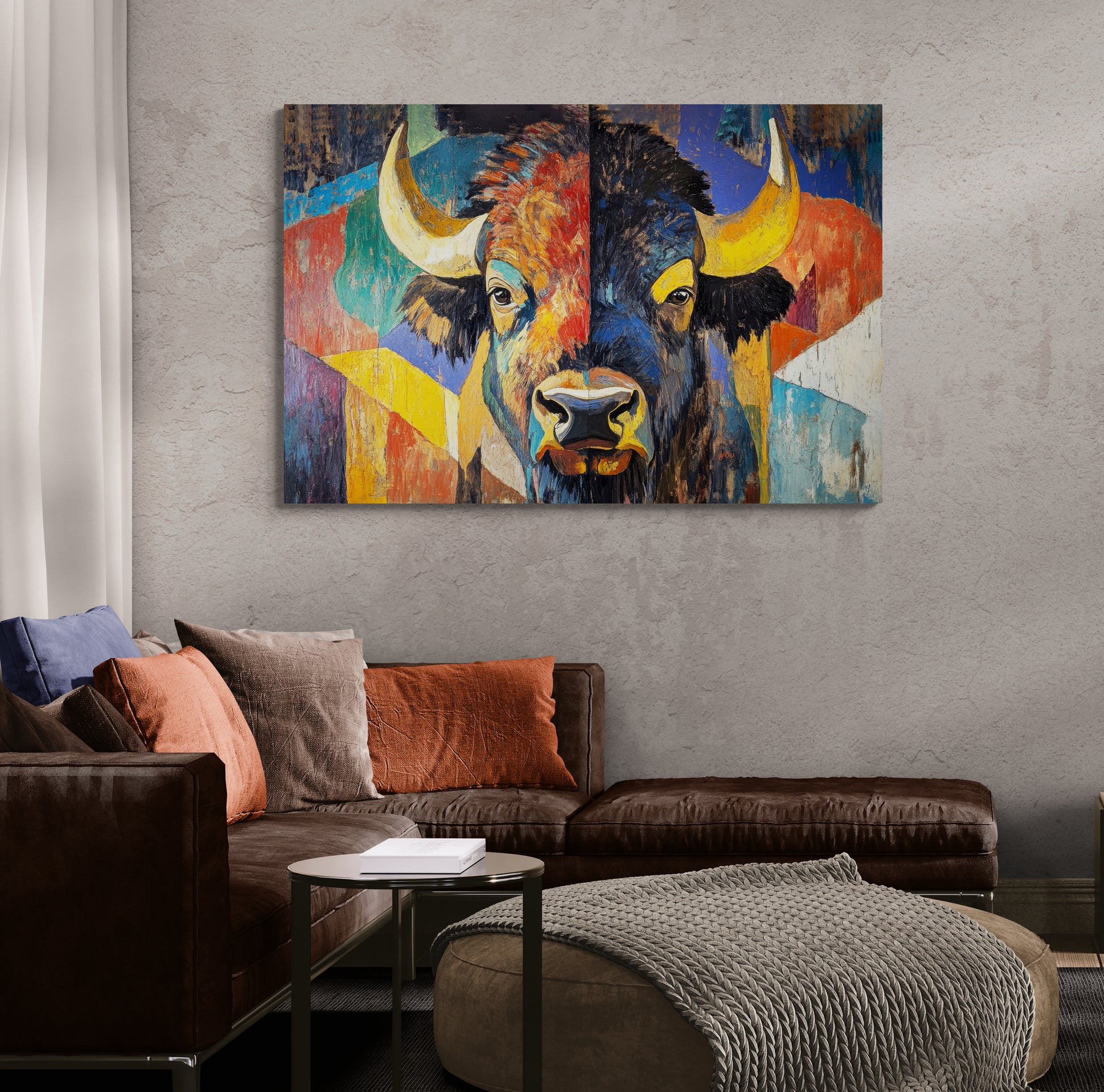 BISON EYES - The vibrant color, loose brushstrokes and bold graphic style of this beautiful abstract work first get your attention, then guide you to the calm, contemplative expression in the bison’s eyes. This stunning artwork makes a perfect statement piece and pairs well with AMERICAN BISON.