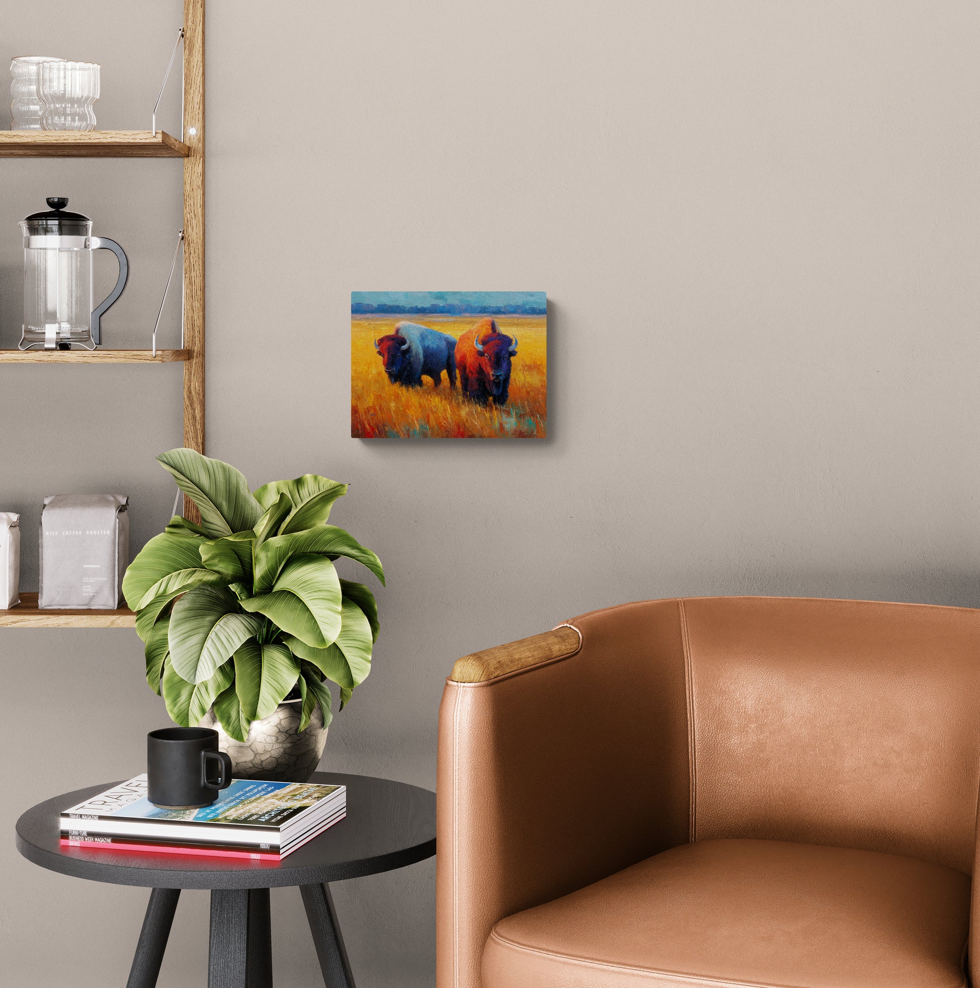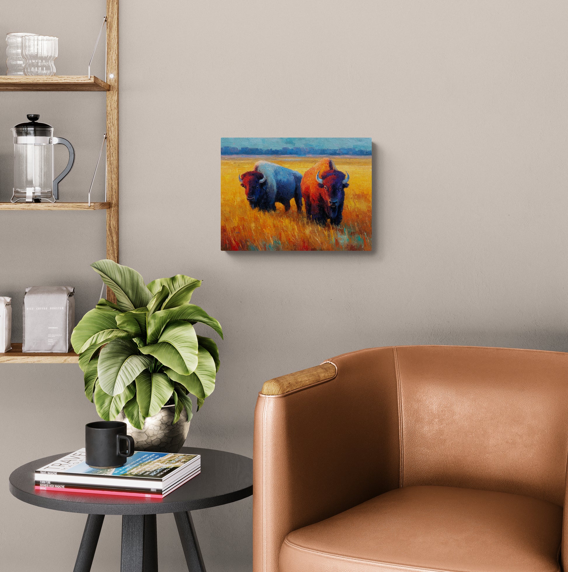 BISON IN FALL GRASS – The warm golden hour lighting and rich color combine with loose, expressive brushwork to create an intimate glimpse into the world of these beloved animals. Power, beauty, warmth, curiosity, this work invokes them all.