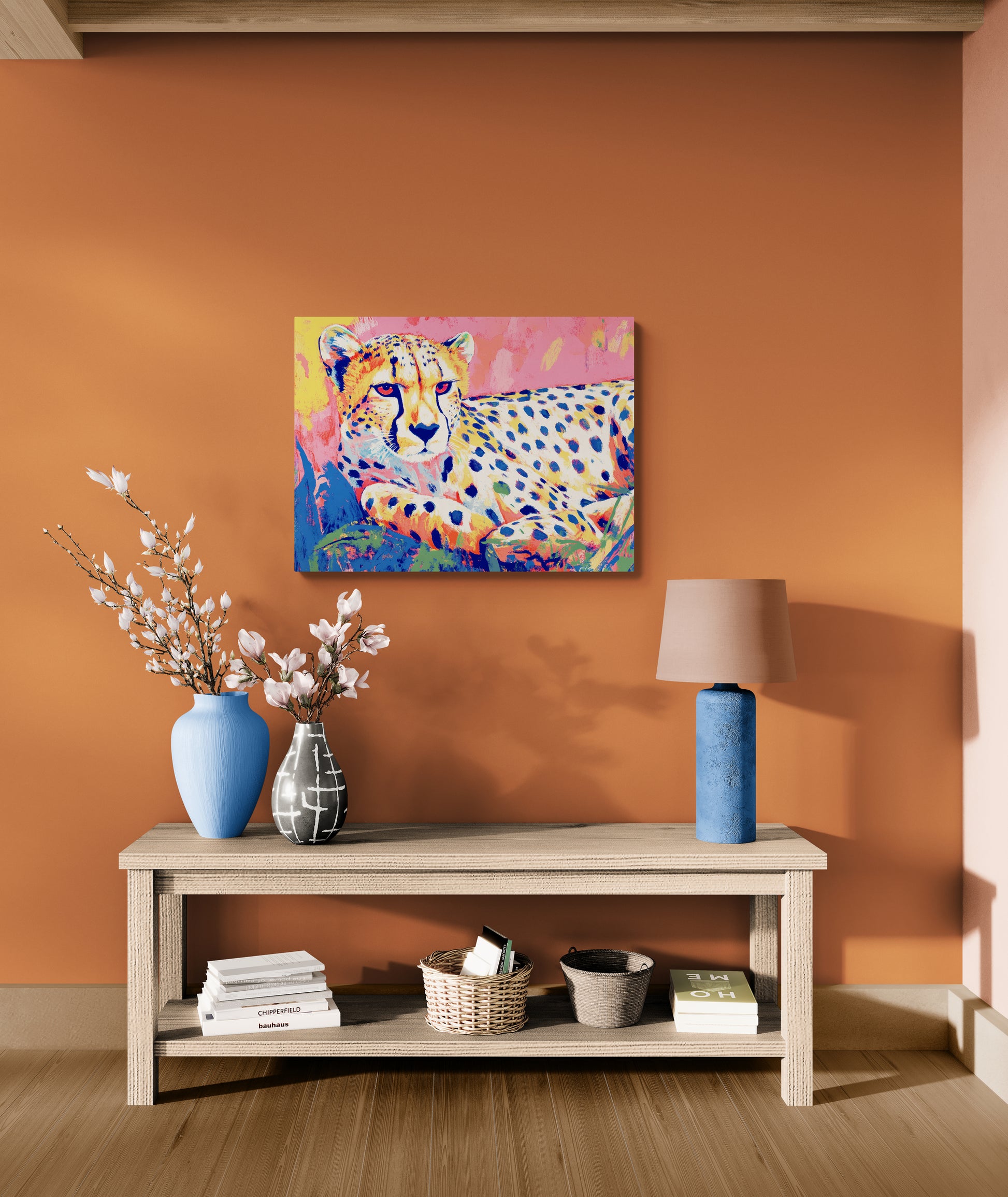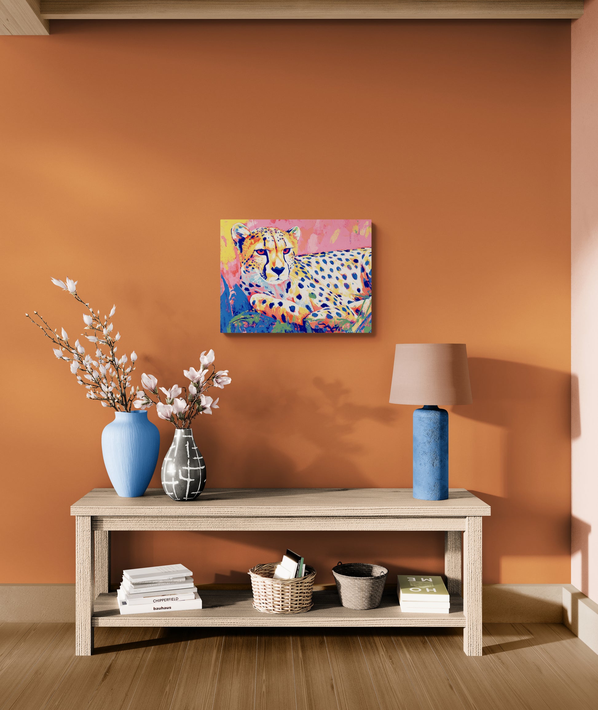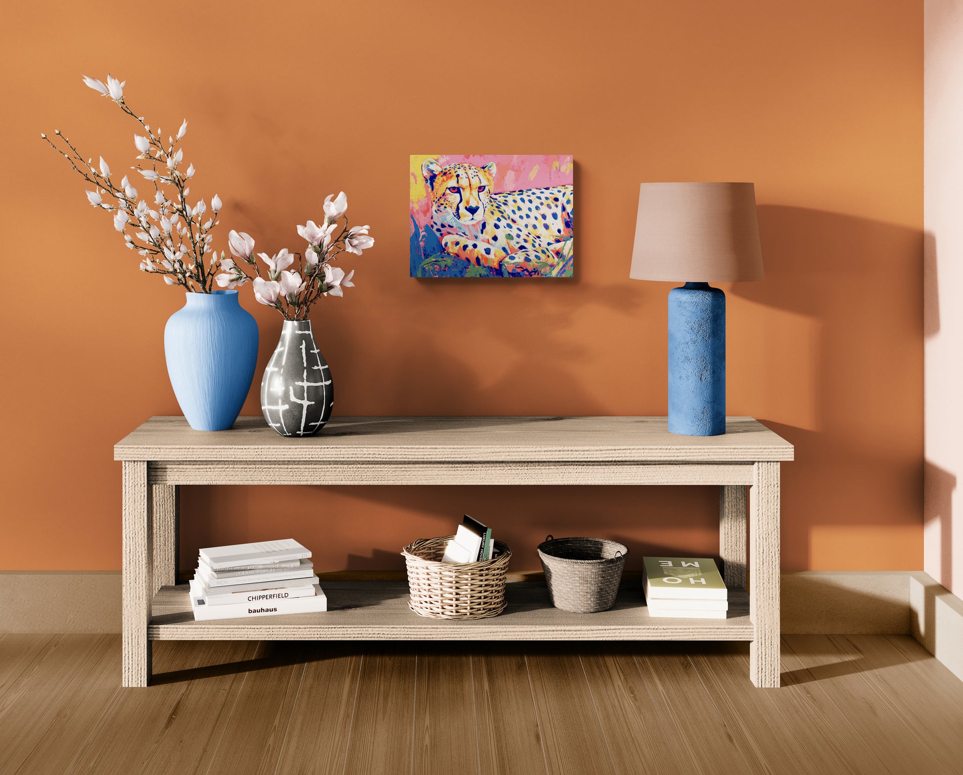 CHEETAH LOUNGING – How can an animal look so intensely focused and yet it’s body so completely relaxed? This gorgeous cheetah accomplishes just that. The warm party color palette and loose, expressionist style only add to the intrigue and delight.