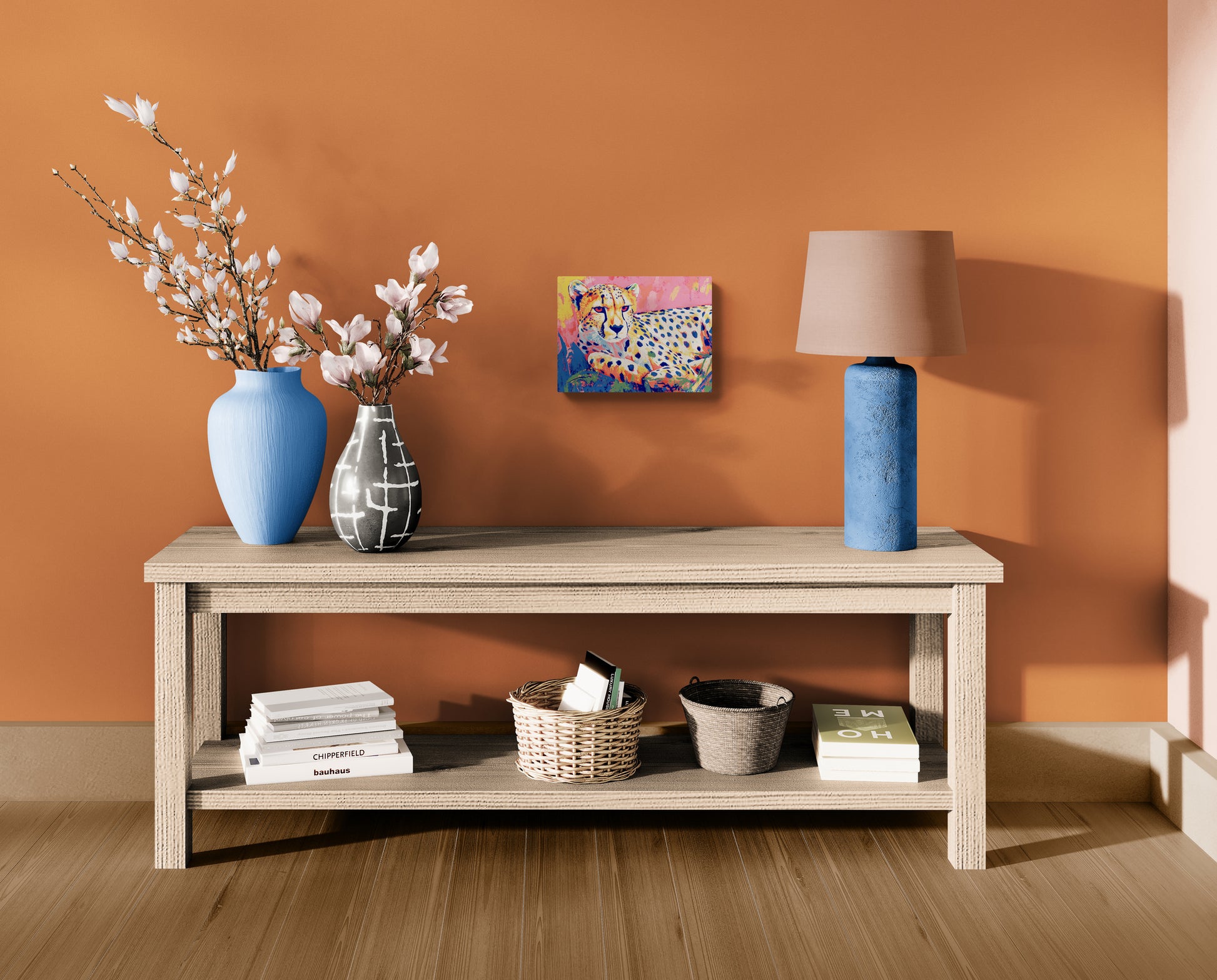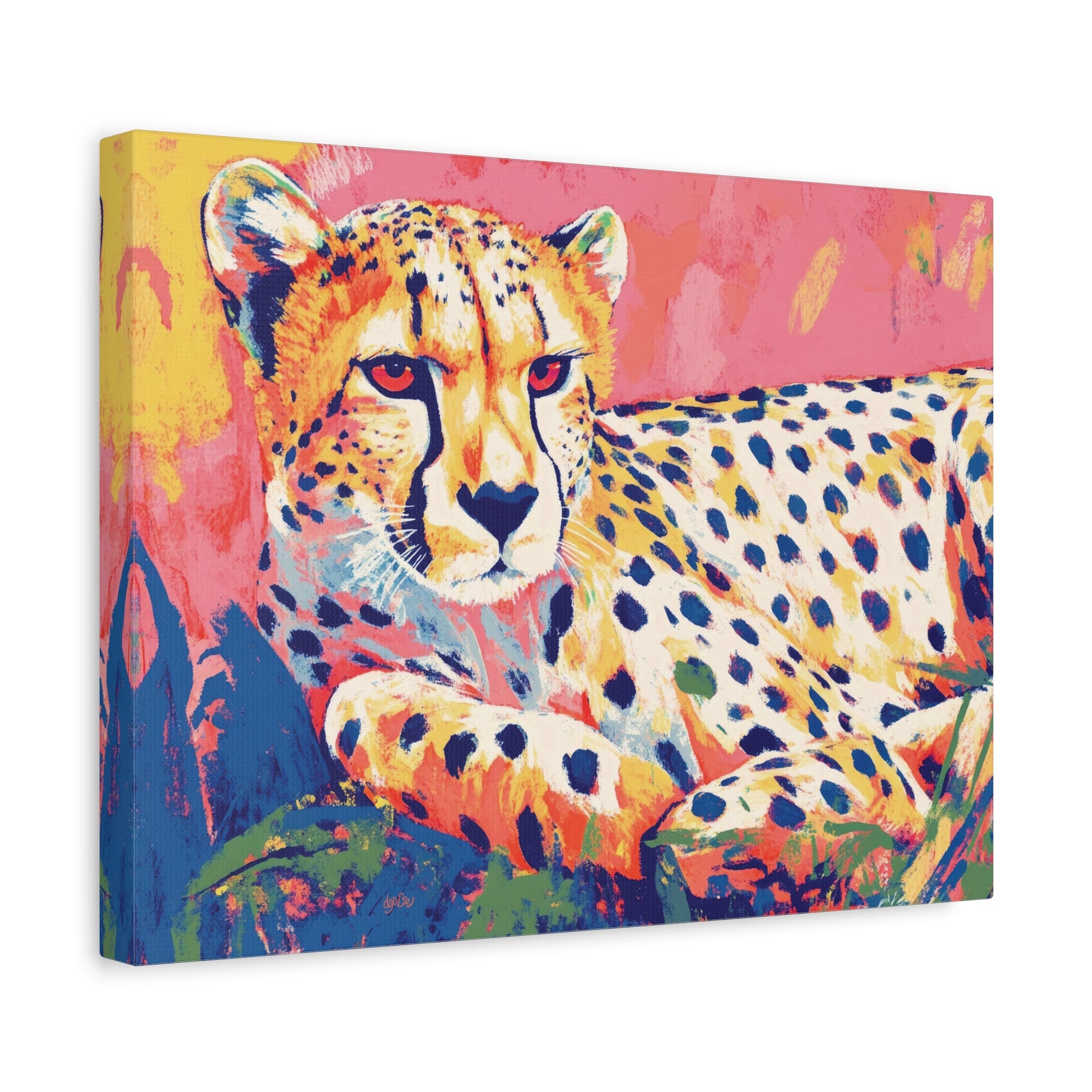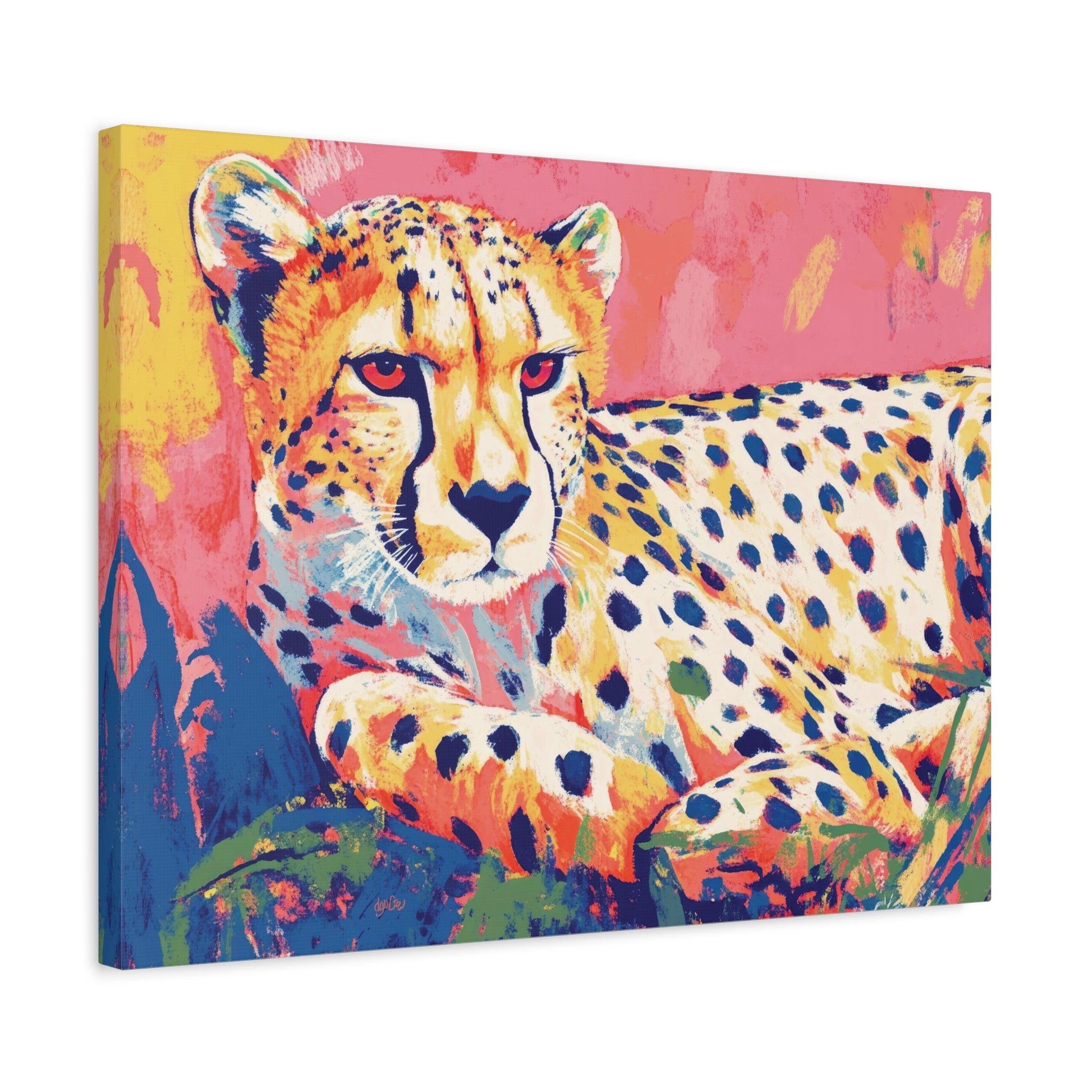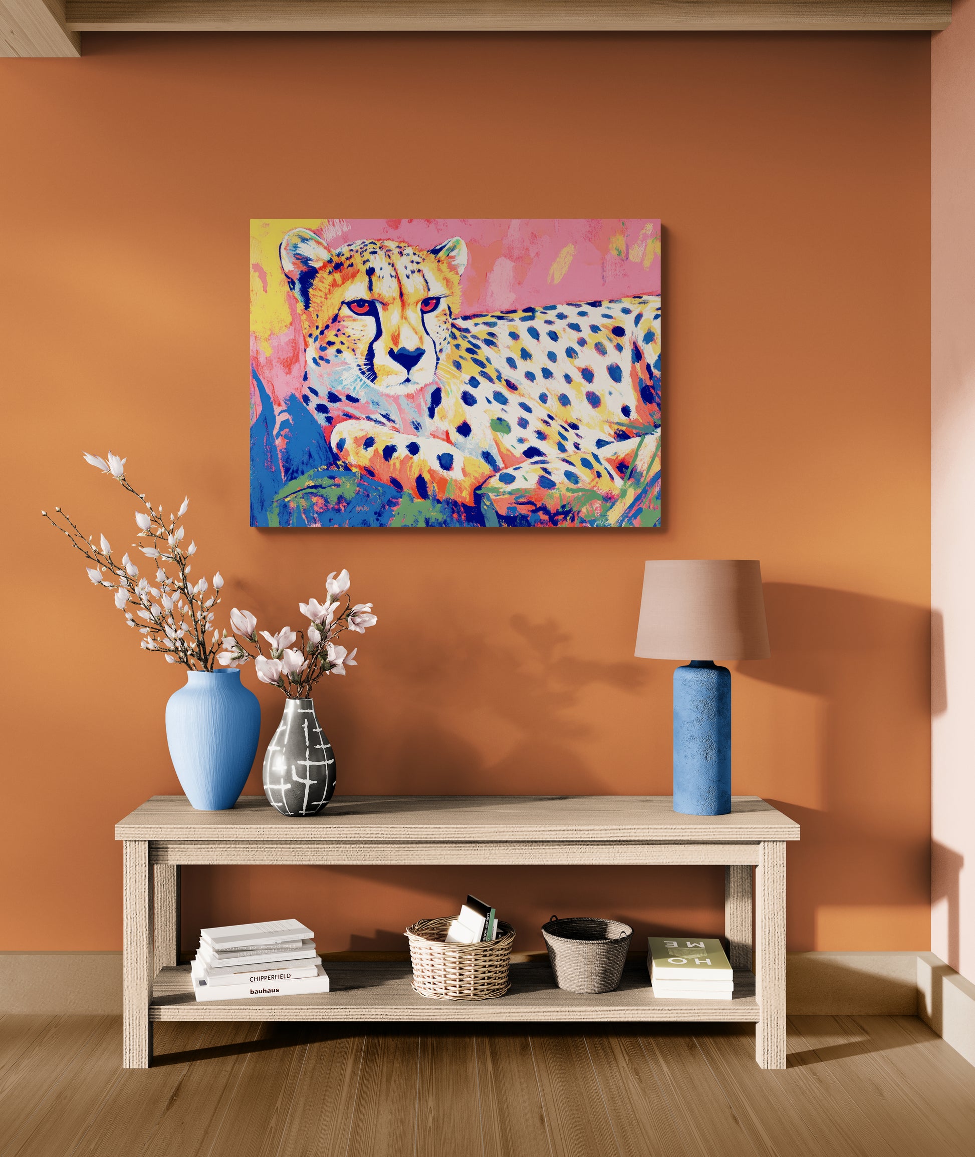 CHEETAH LOUNGING – How can an animal look so intensely focused and yet it’s body so completely relaxed? This gorgeous cheetah accomplishes just that. The warm party color palette and loose, expressionist style only add to the intrigue and delight.