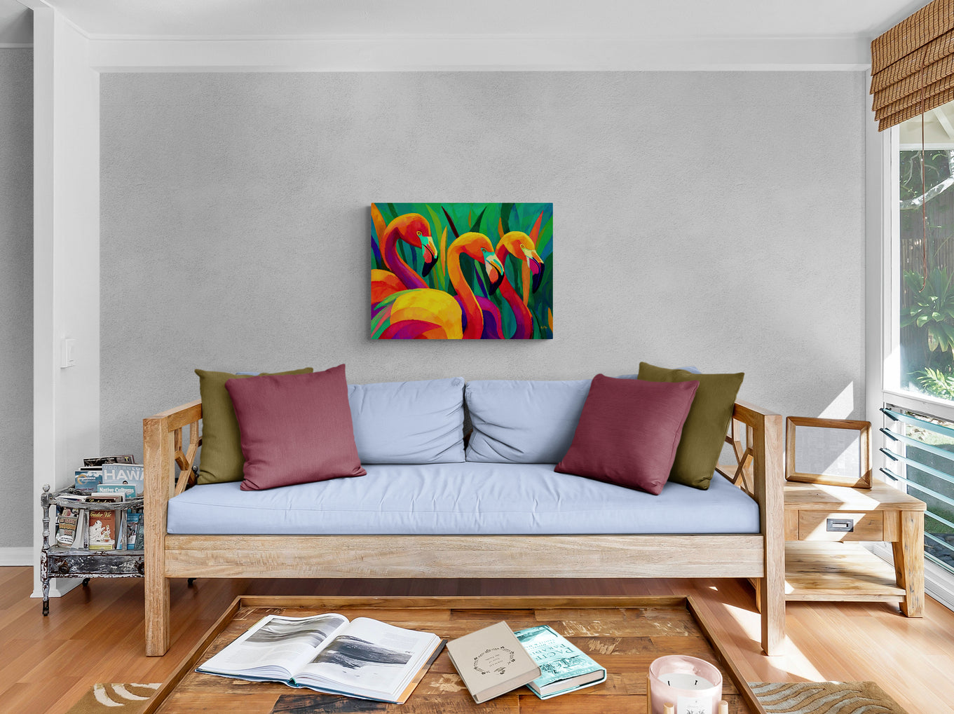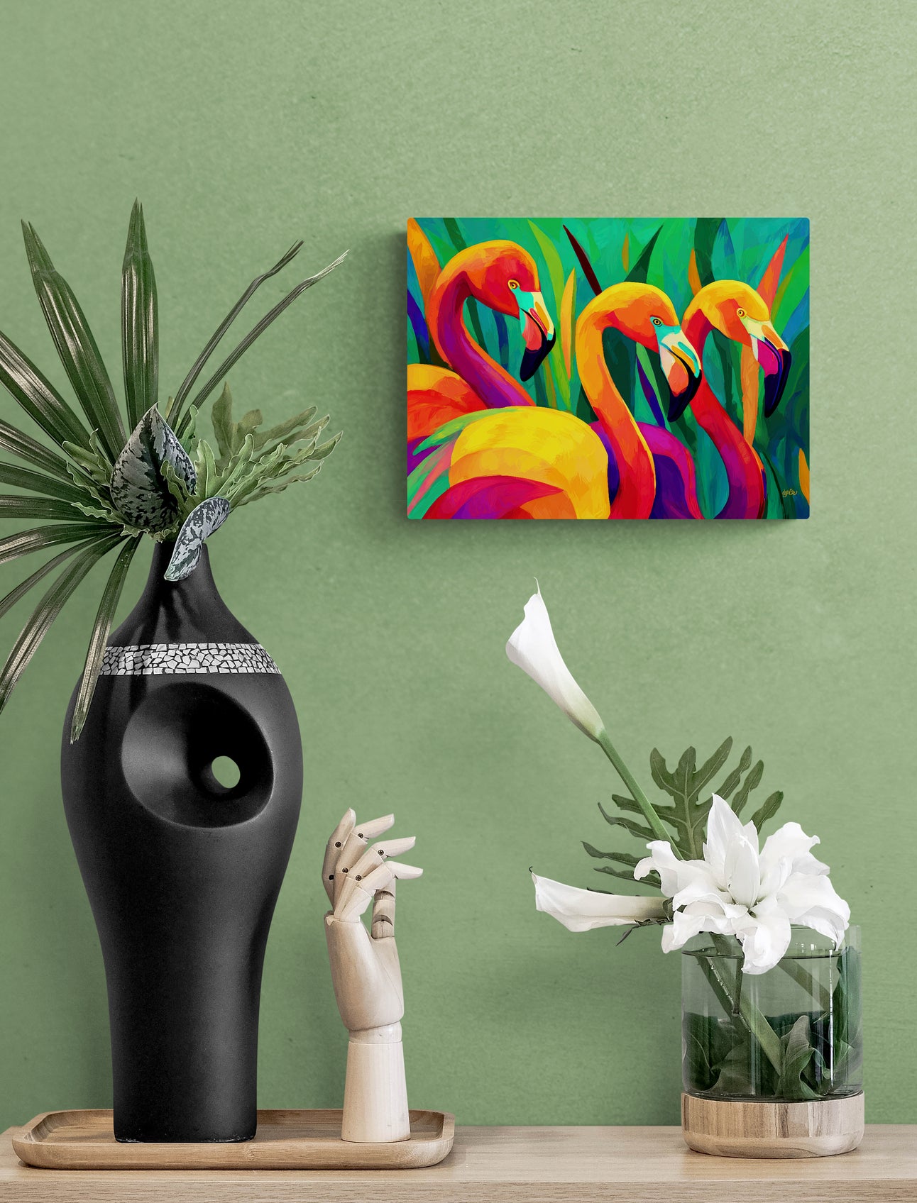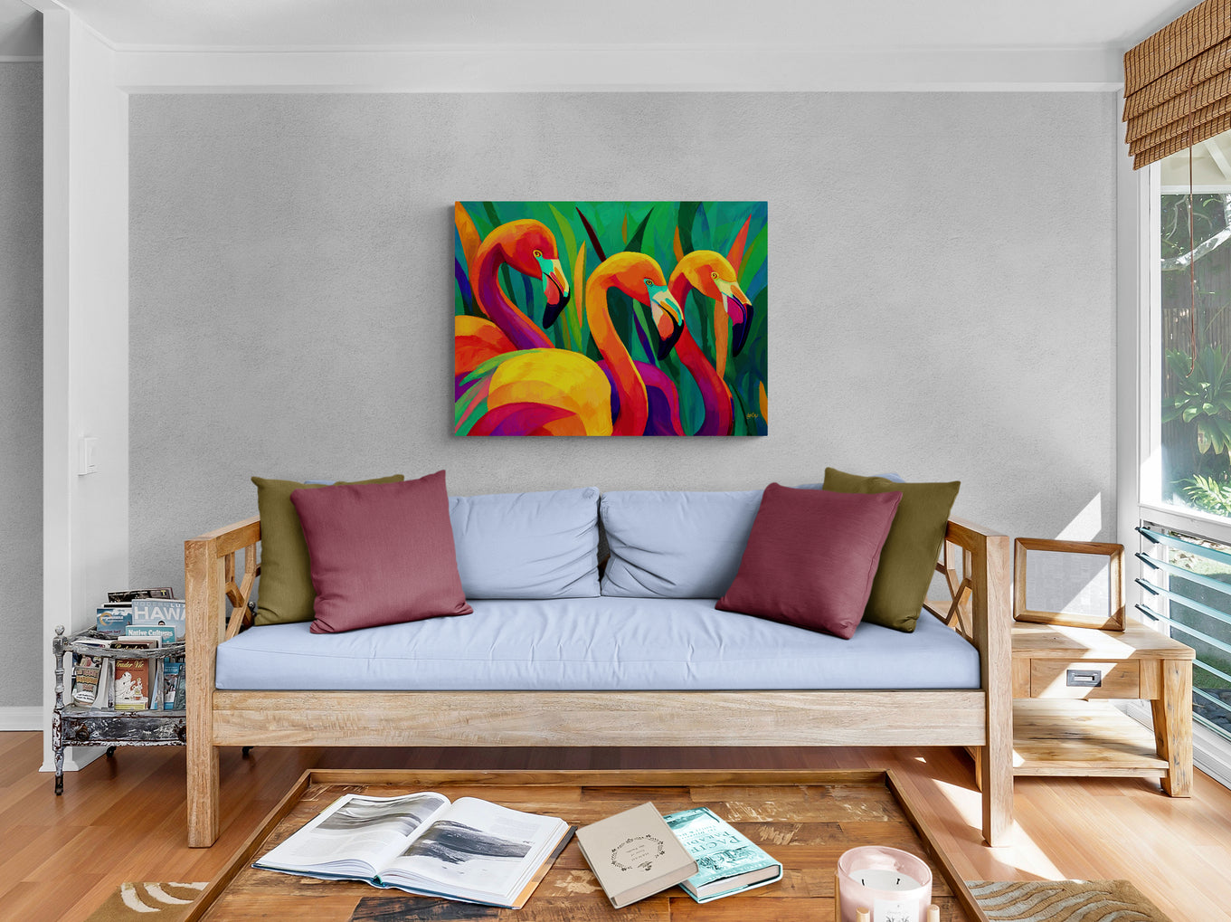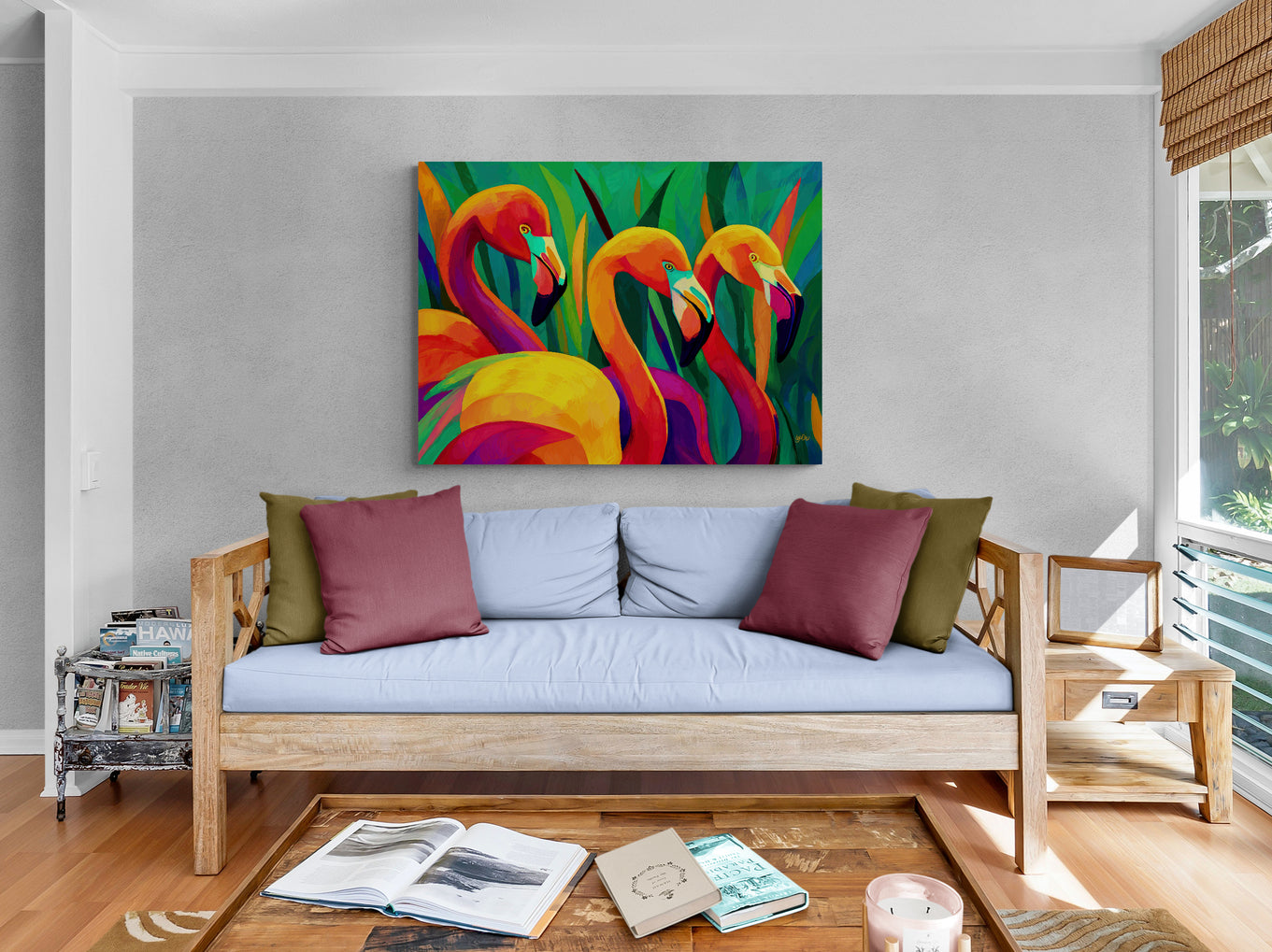 FLAGRANT FLAMINGOS – Bold, vibrant colors grab your attention and generate excitement, then the subtle, individual expressions in the eyes and the graceful curves that shape the heads and necks lure you in to this delightful, compelling and curious piece.