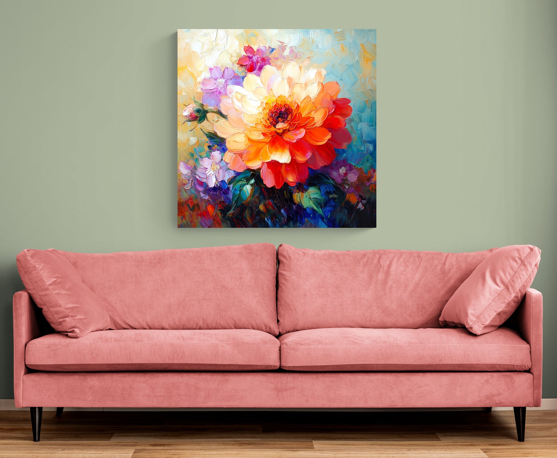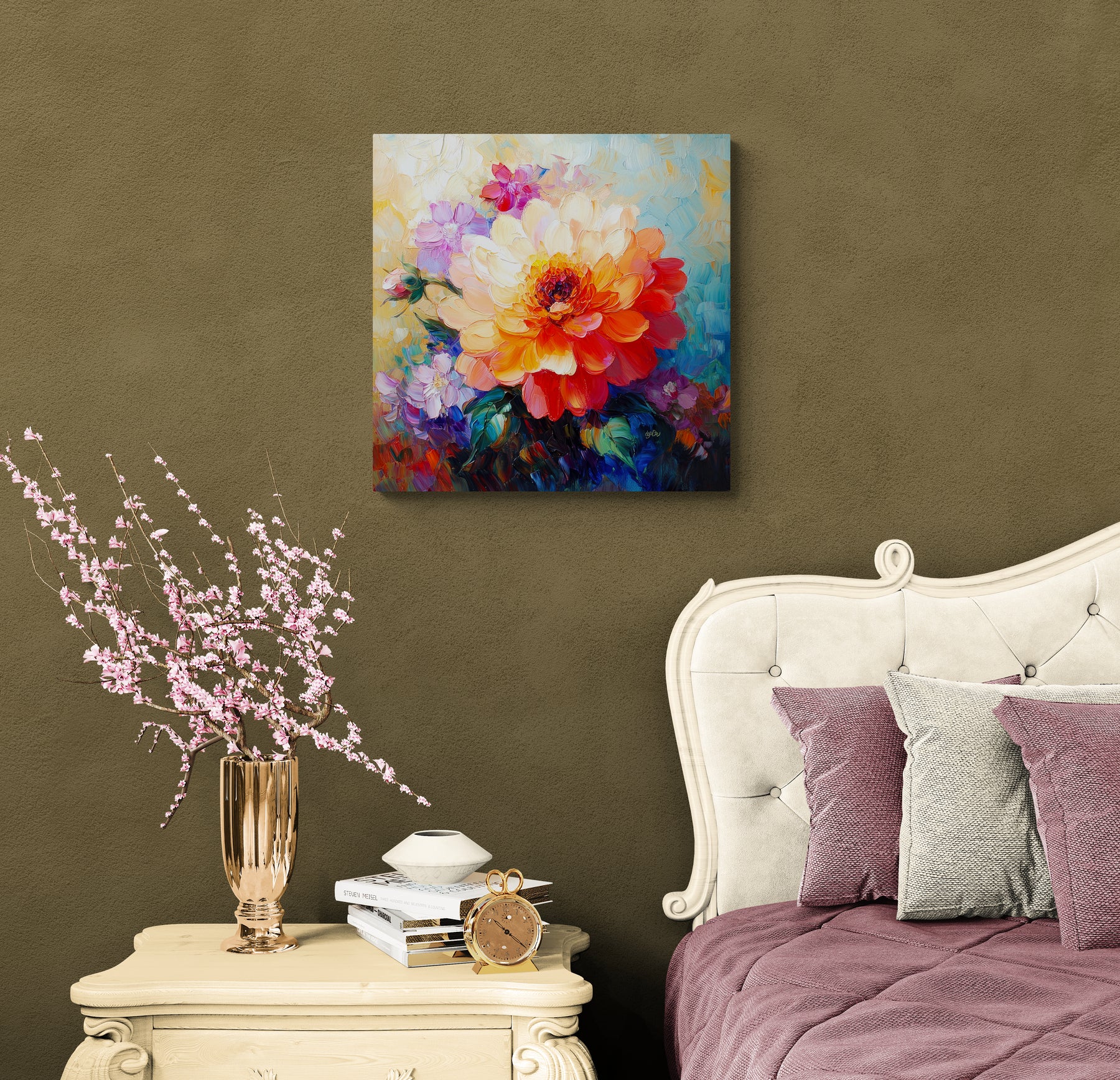 FLORAL STUDY 1 – Brilliant color and thick, painterly brushwork give this floral study a glowing, expressive presence. The large central bloom draws the eye immediately, while the surrounding blossoms add softness, richness, and delight.