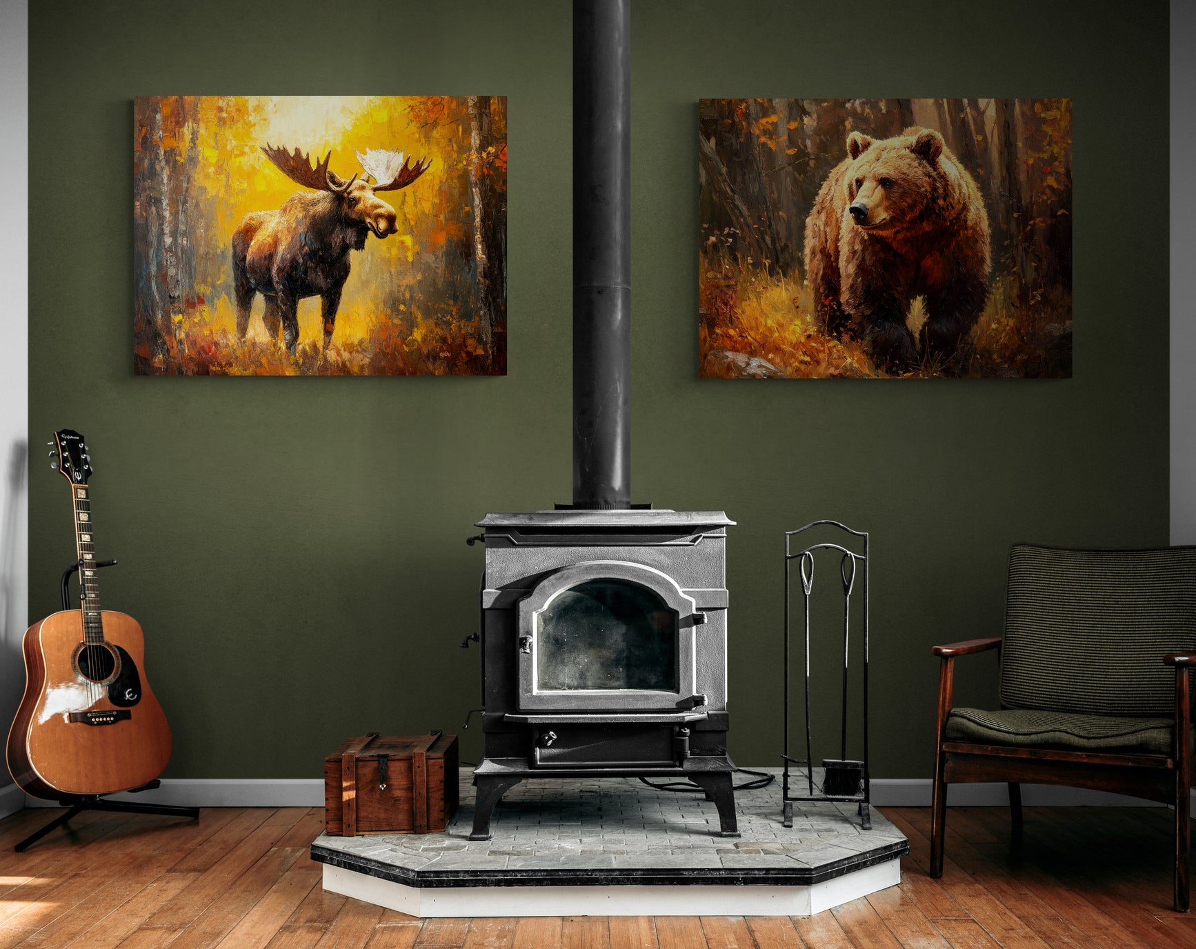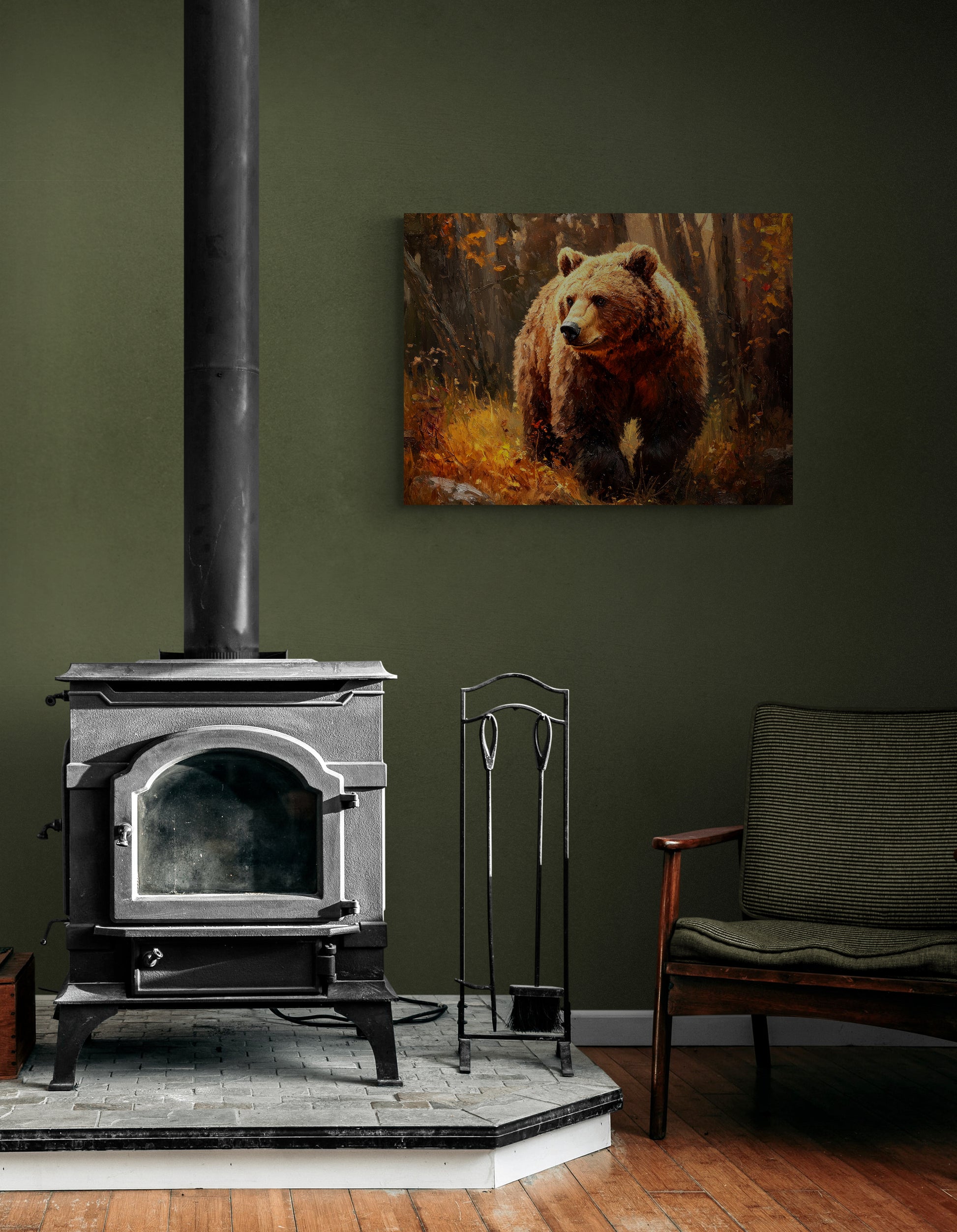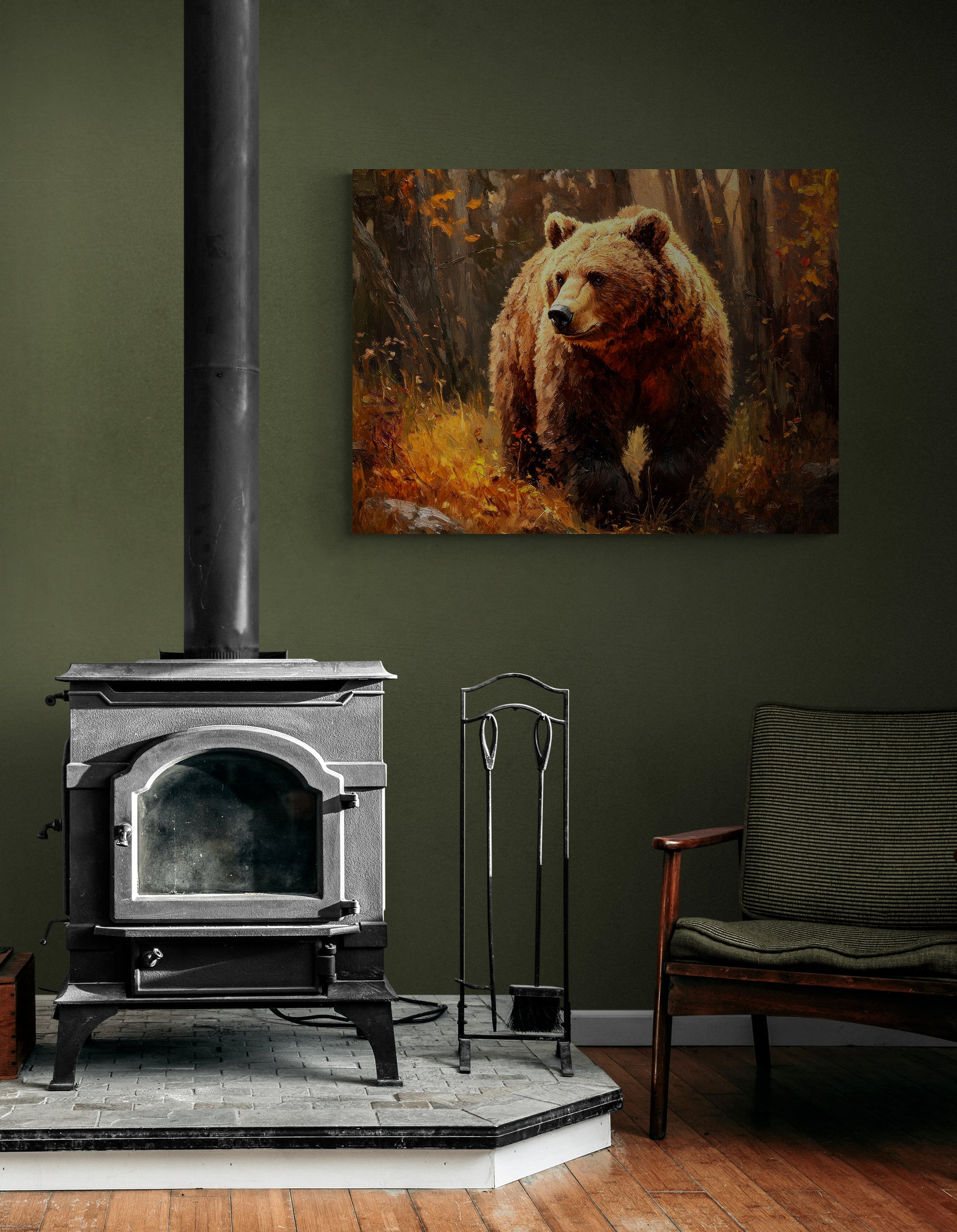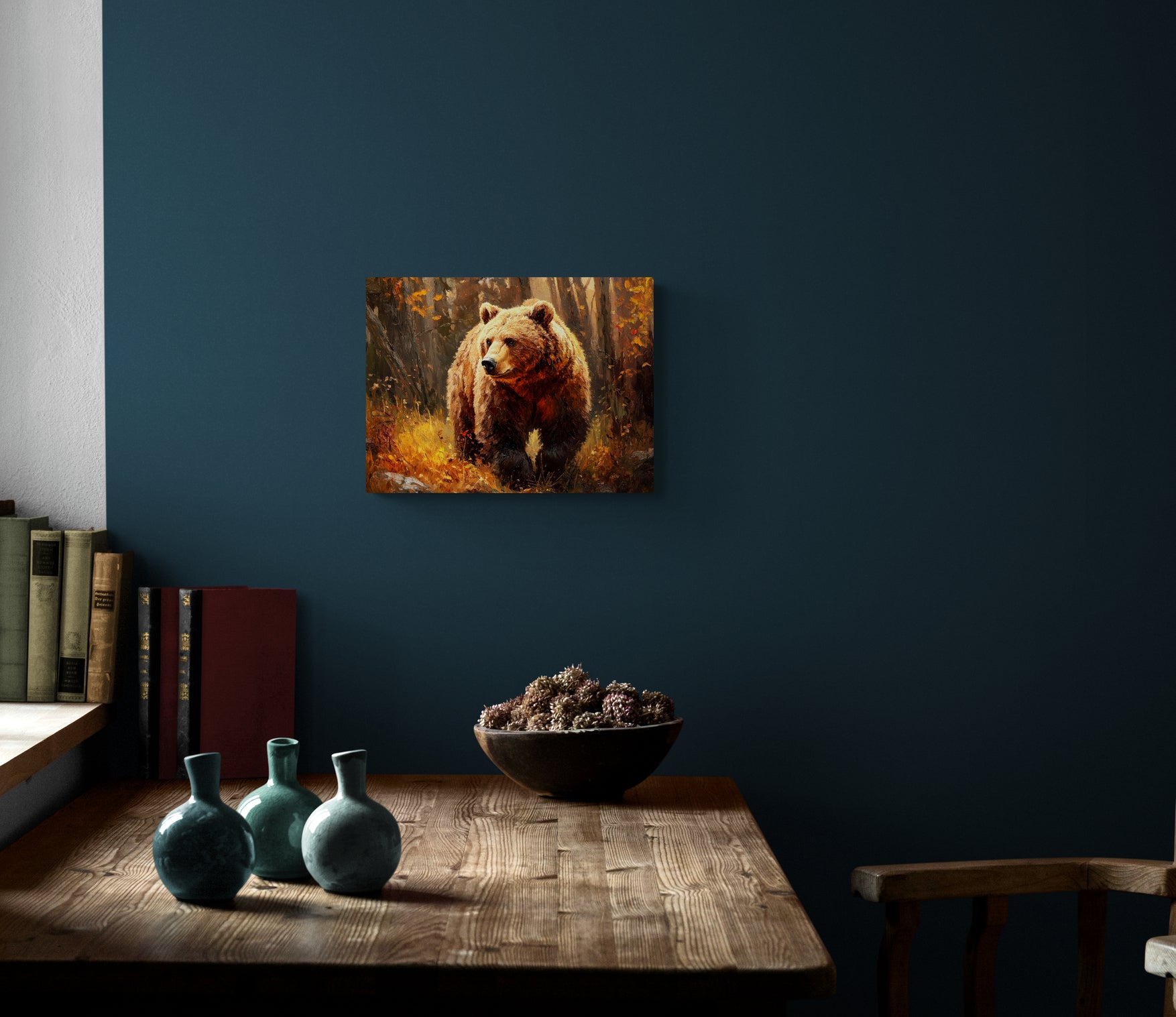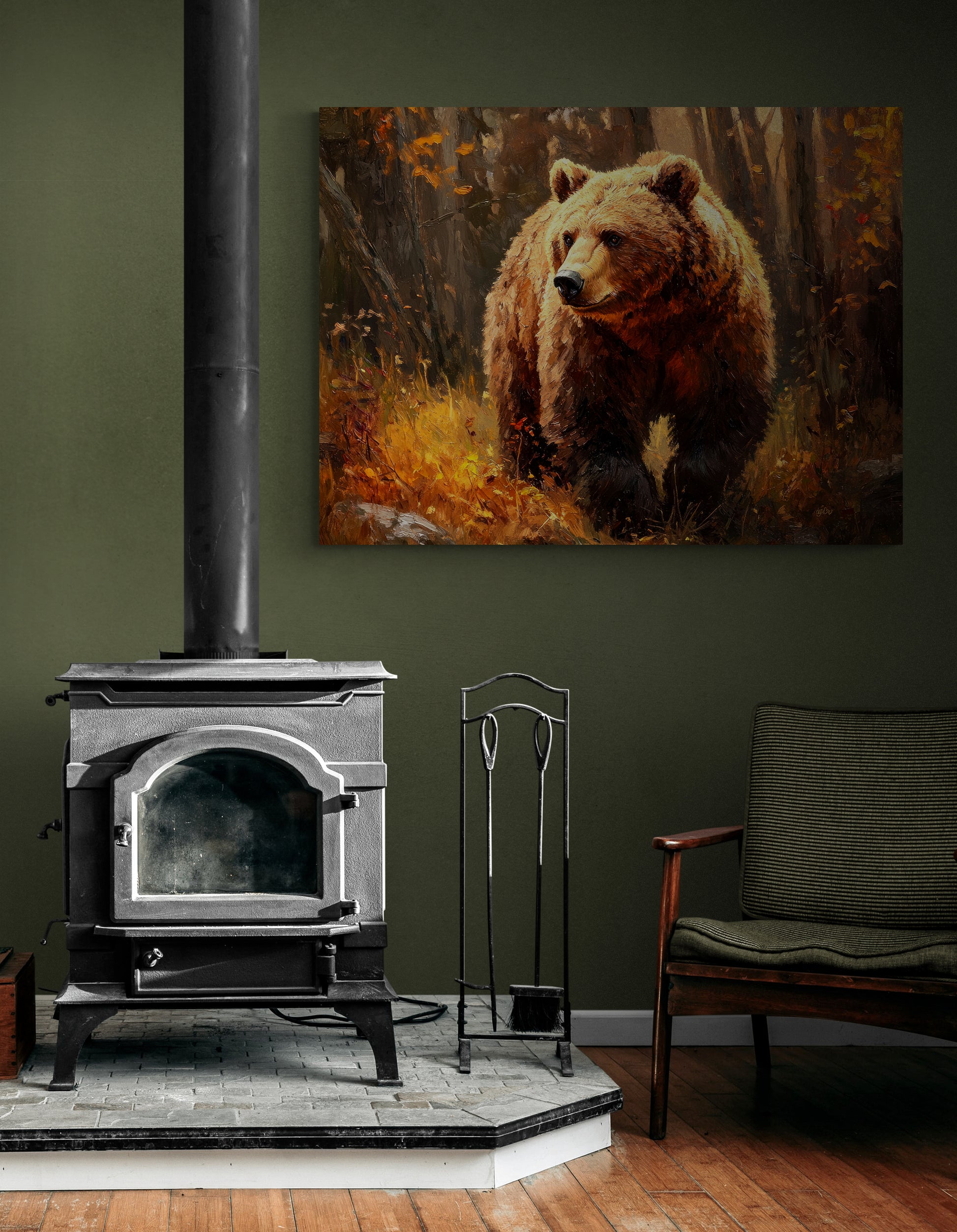 GOLDEN GRIZZLY – Thick paints, expressive brushwork and classic style make for a rich, warm and engaging portrait, capturing the fierce beauty and power of this mighty grizzly bear. A calm moment captured in the bears day yet vibrating with an underlying sense of its explosive strength. Looks great paired with “AUTUMN MOOSE”.
