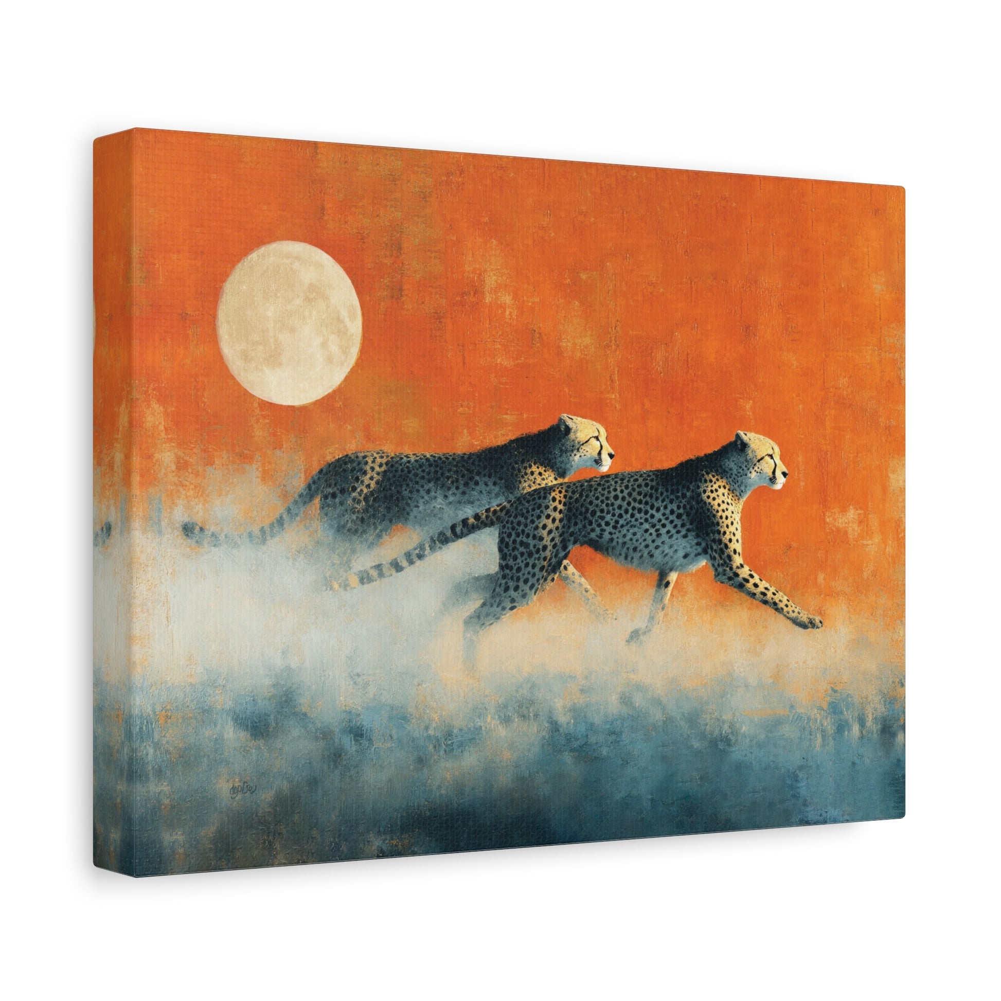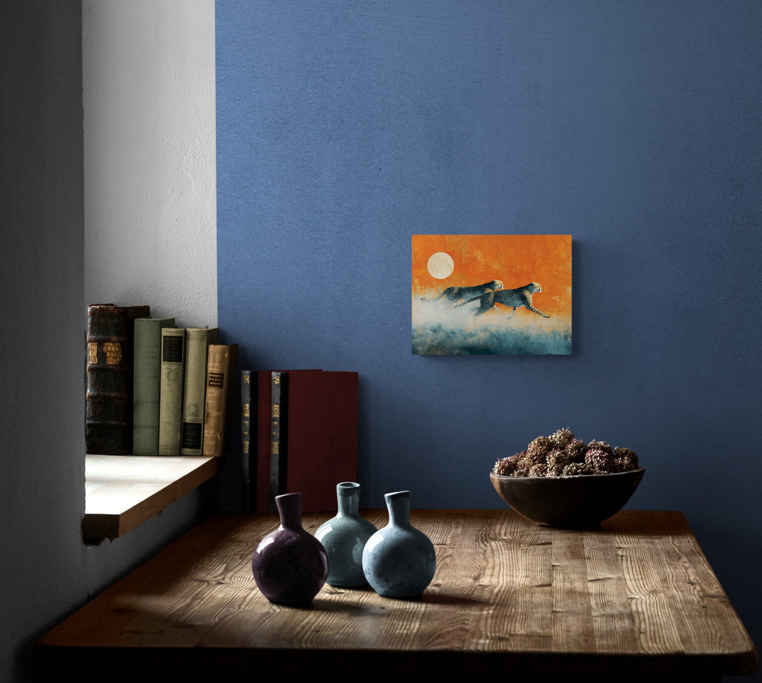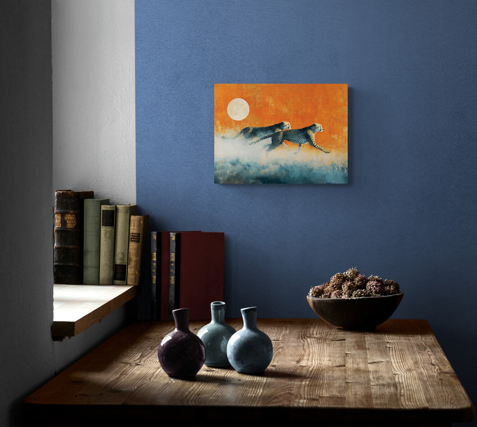 SUNRISE, FULL MOON CHEETAHS – A full moon sinks in the savanna sky as the blazing sunrise claims the day. Out of the mist lopes two powerful cheetahs, masters of their domain. This gorgeous and dynamic painting is a perfect statement piece.