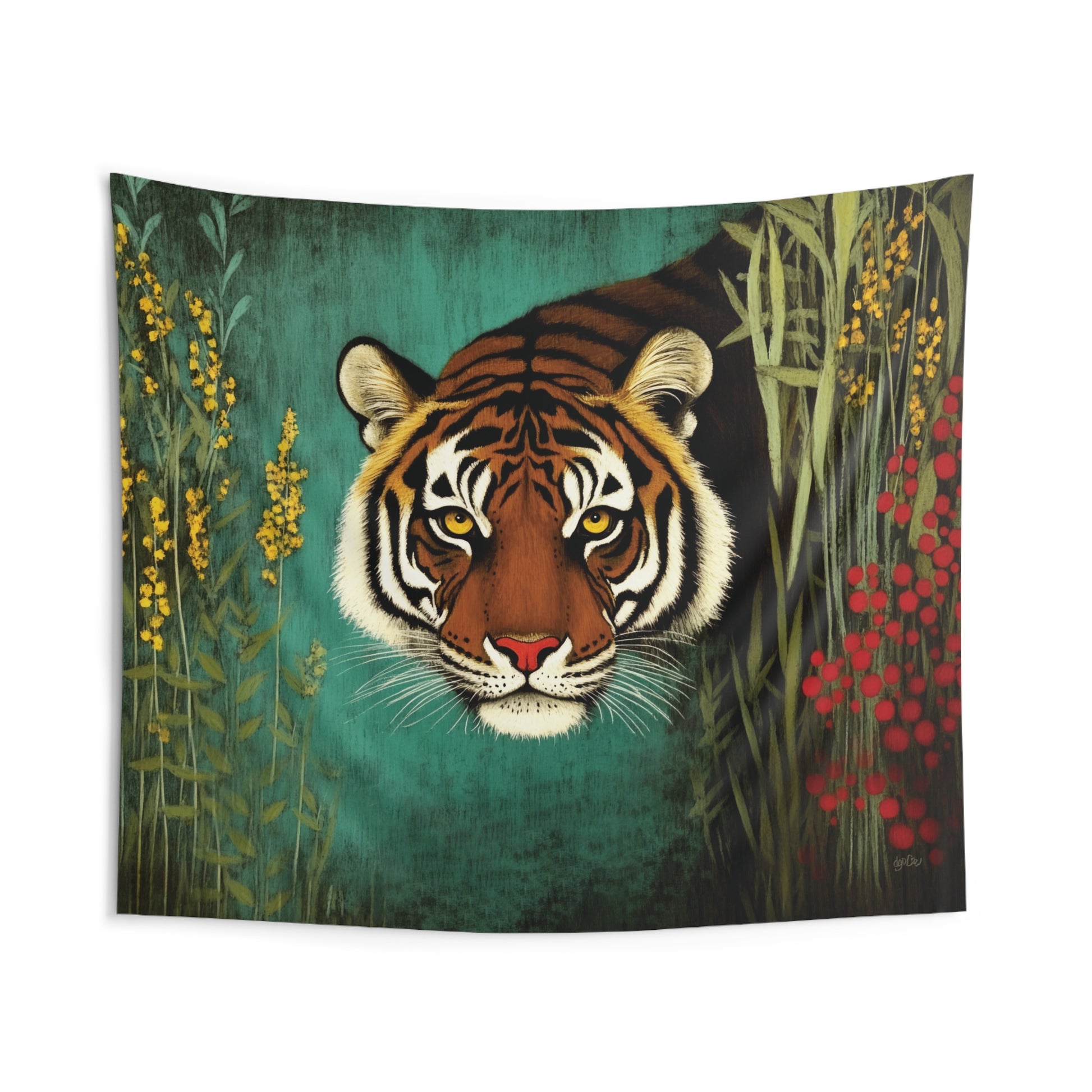 TIGER, TIGER – The powerful tiger commands attention as it’s massive head peers out of the willowy rainforest grasses. The artful blend of bold with delicate elements make this tapestry an intriguing piece to enjoy and contemplate.