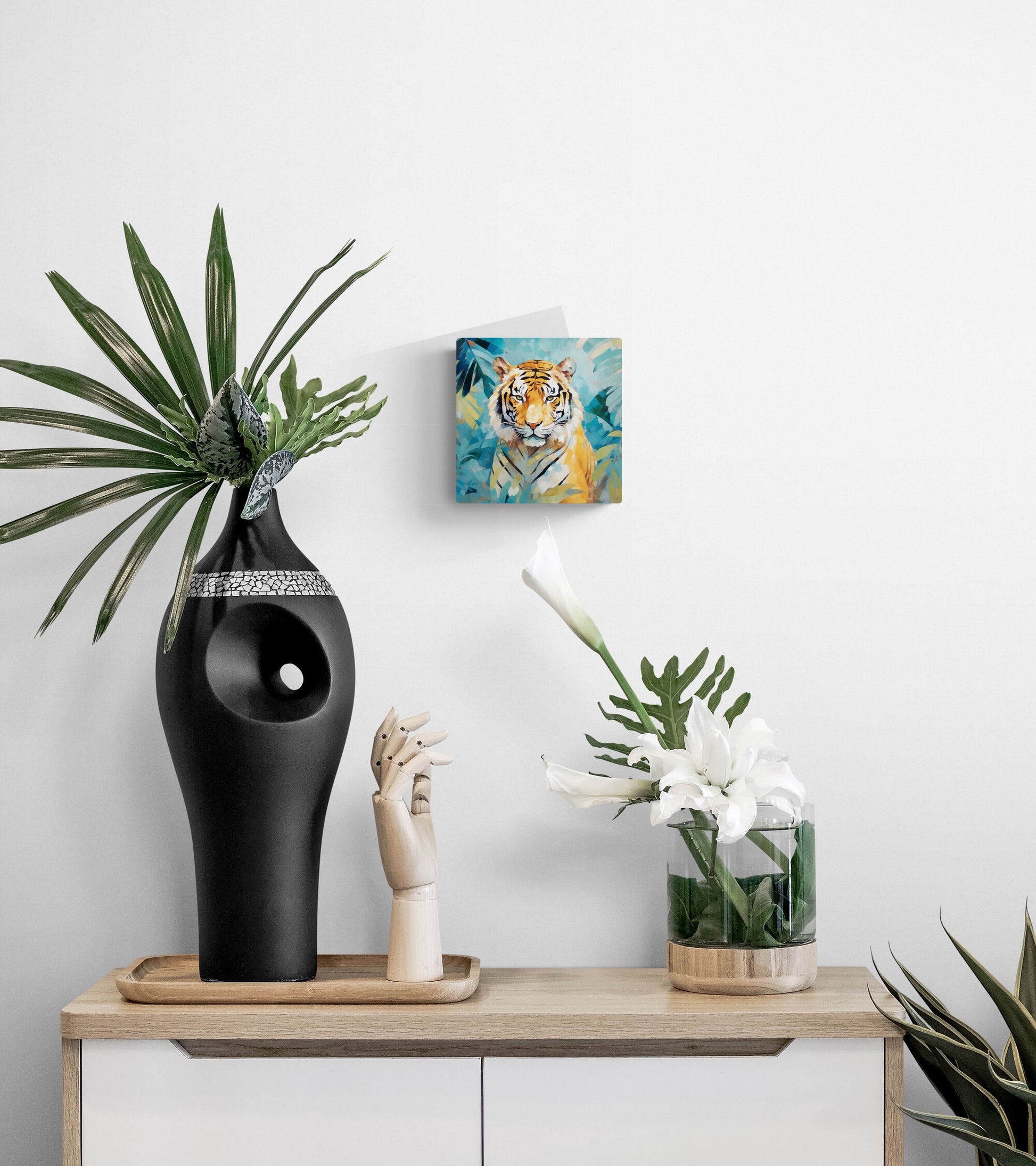 TROPICAL TIGER – The striking gaze of the tiger, along with the gorgeous tropical colors, expressive brushstrokes and abstracted style make this a bold, fresh and captivating piece for your home.