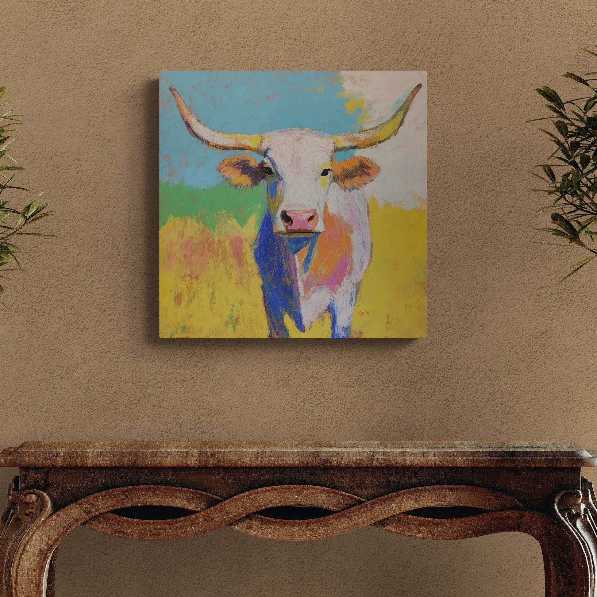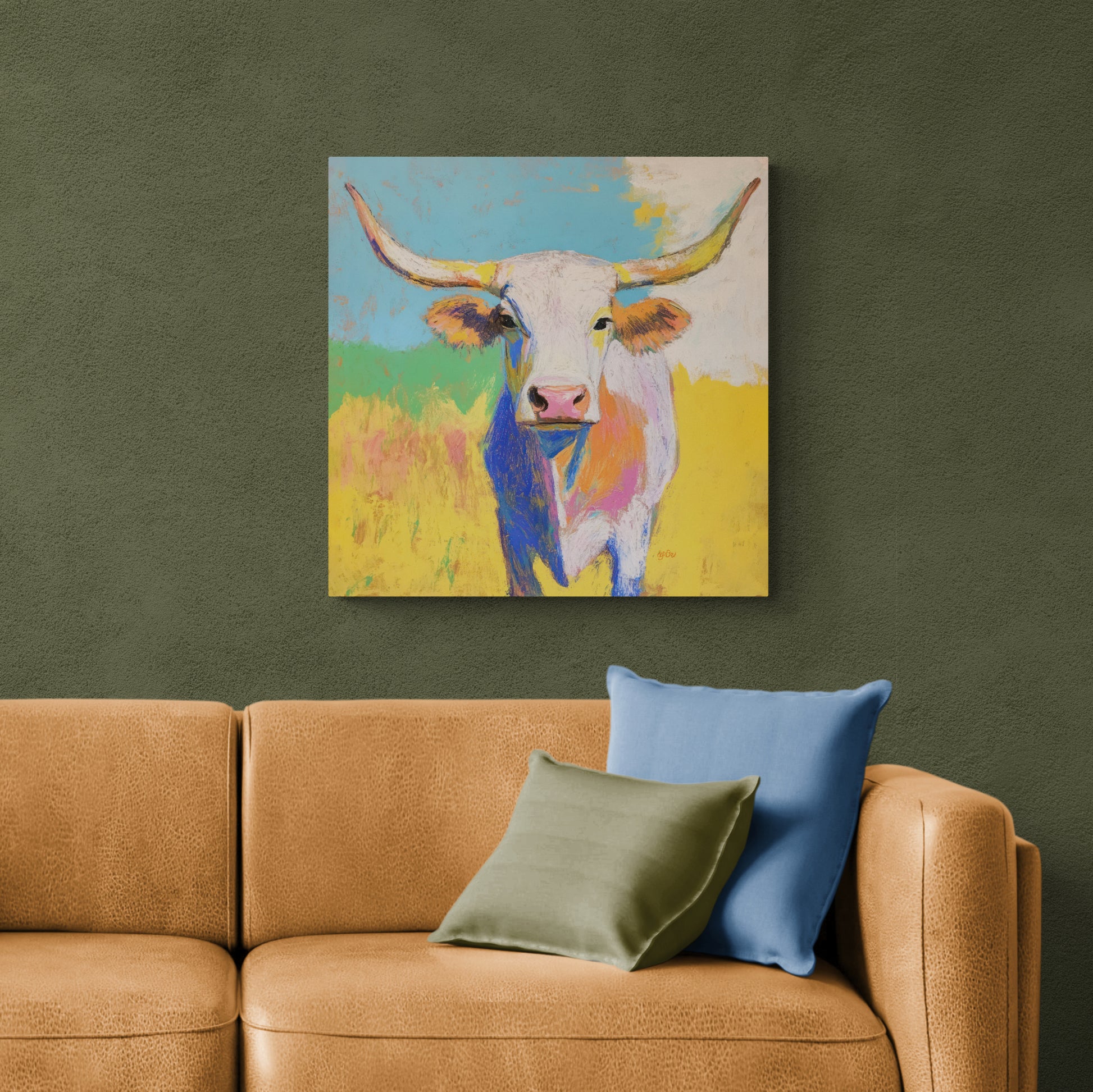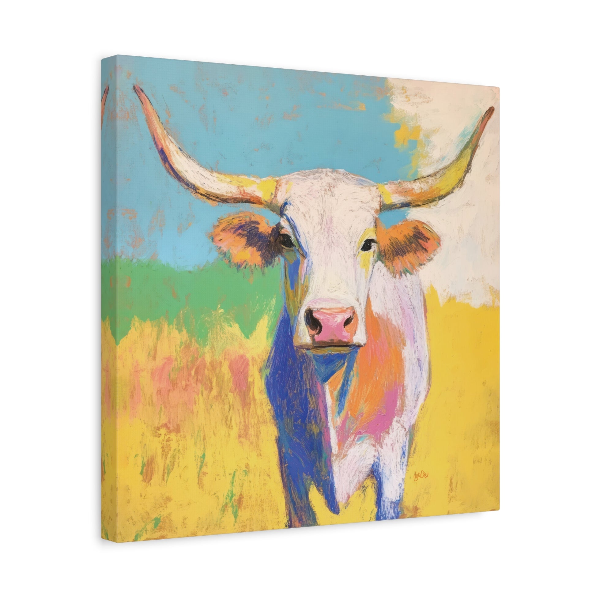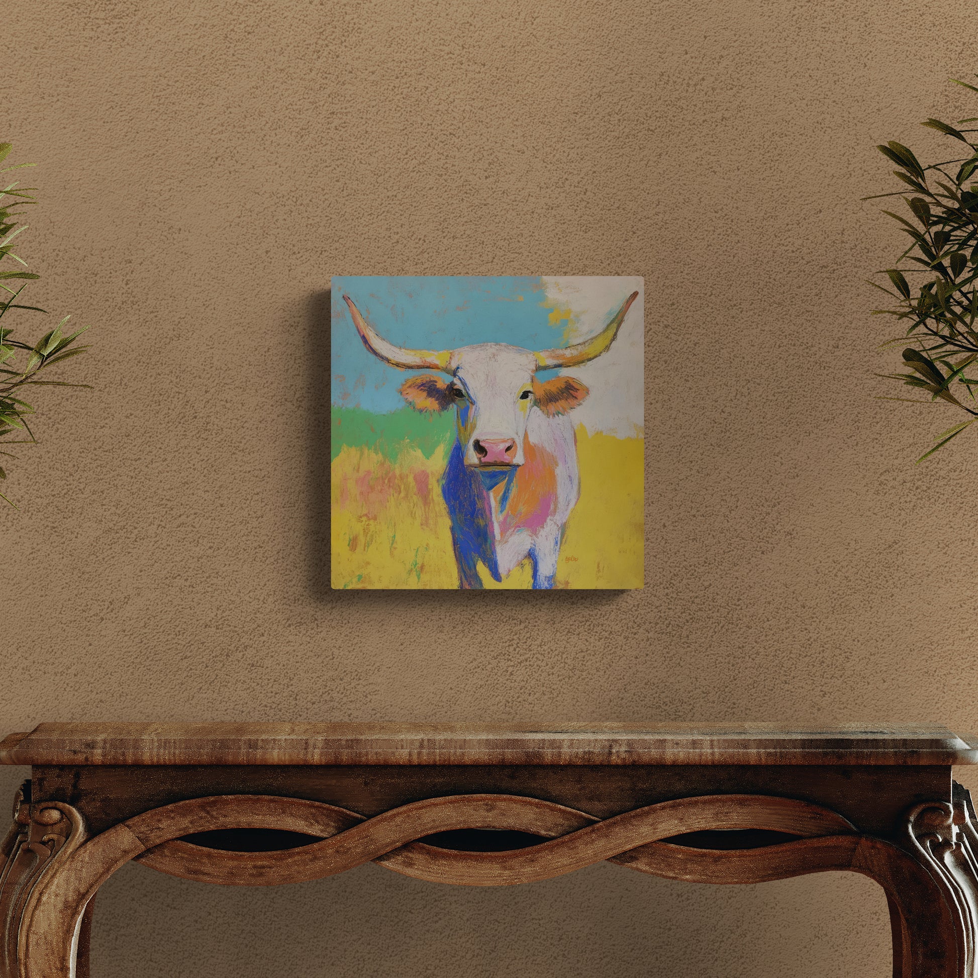 YELLOW GRASS LONGHORN – Bright color and loose, expressive brushwork give this longhorn portrait a warm and welcoming personality. Exuding strength, curiosity and charm, this piece is both lively and engaging. Pairs well with BLUE SKY LONGHORN.
